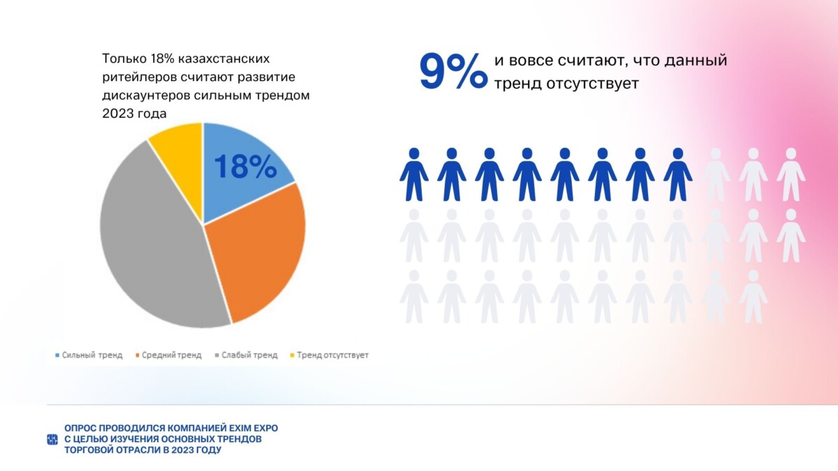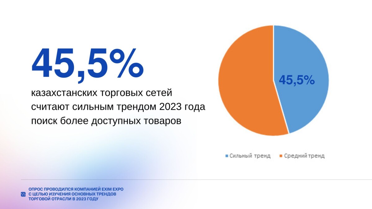 Согласно опросу, 45,5% казахстанских торговых сетей, участвовавших в опросе, признают, что актуальным трендом этого года является поиск более доступных товаров на смену товарам, цена на которые выросла. 55,5% ритейлеров также признают данный тренд, но дают ему среднюю оценку.