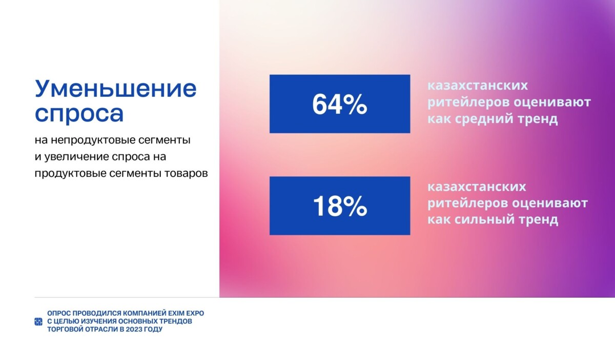 64% казахстанских торговых сетей выделяют небольшое уменьшение спроса на непродуктовые сегменты товаров, 18% опрошенных ритейлеров считают данный тренд сильным. Потребительский спрос переключается на продовольственную корзину. Также в опросе было отмечено, что в настоящее время проблем с доступностью ассортимента в категории нон-фуд больше, чем с продовольственными категориями.