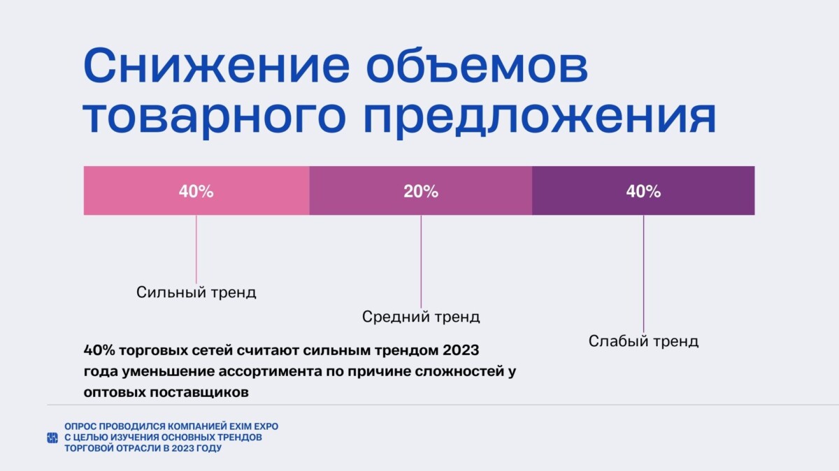 Только 20% казахстанских ритейлеров выделяют в качестве сильного тренда изменение стабильного набора брендовых товаров на полках магазинов, которые пользуются спросом у покупателей, 40% характеризуют его как средний тренд. 40% торговых сетей наблюдают снижение объемов товарного предложения на рынке и уменьшение ассортимента по причине сложностей у оптовых поставщиков.