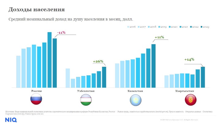 На фоне растущей инфляции доходы населения стран Центральной Азии также увеличиваются. Так, например, в Узбекистане в 2023 году зарплаты выросли больше всего – на 26%, в Казахстане — на 11%, в Кыргызстане – на 14%. В России наоборот средняя месячная заработная плата в 2023 году упала на 11%.