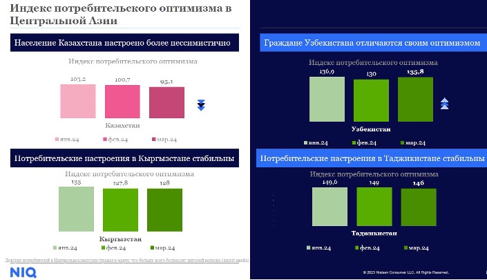 В марте 2024 года он составил 95,1% по сравнению с 103,2 % в январе 2024 года. Другие страны Центральной Азии настроены более положительно. Особенно оптимистично смотрят на свое финансовое положение граждане Узбекистана. В марте 2024 года индекс потребительского оптимизма у них составил 135,8%.