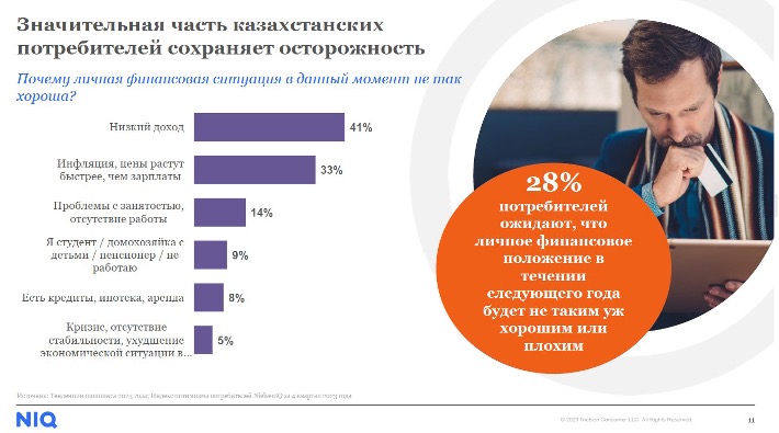 Значительная часть казахстанских покупателей считают личную финансовую ситуацию недостаточно хорошей. 41% казахстанцев считают причиной этого низкий доход, 33% — инфляцию, из-за которой цены растут быстрее, чем зарплата. А 14% связывают это с отсутствием постоянной работы.