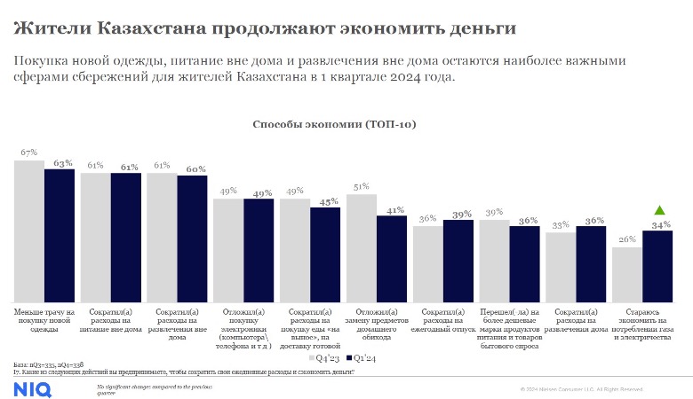 Это вынуждает казахстанцев сократить свои расходы. 63% респондентов отметили, что стали меньше тратить на покупку одежды, 61% сократили расходы на питание вне дома. 34% казахстанцев стараются экономить на потреблении газа и электричества, это на 8% больше по сравнению с прошлым годом.